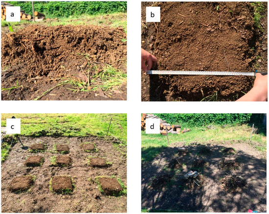 The experimental approach is built along the lines of previously published studies [29,30,32] measuring fire effects on soil properties on the basis of setting up experimental fires of different burning intensities. The experimental burning area in our study is located in a 1500 m2 paddock, about 200 m from the source of forest soil, providing a safe area to conduct the experiment. A total of nine 0.5 × 0.5 m plots and 0.225 m3 of forest soil was transported to the area. The litter layer from the soil was removed and the upper 10 cm of mineral soil was collected. Soil was then distributed evenly to form the nine 0.1 m depth plots (Figure 3) to recreate the conditions in the forest. To prevent factors such as slope, drainage and texture affecting our results, all the soil was taken from the exact same location within Damak forest. This area was representative of the whole forest, and no single species dominated the under and overstorey, while the litter layer contained similar material to most of the forest floor.