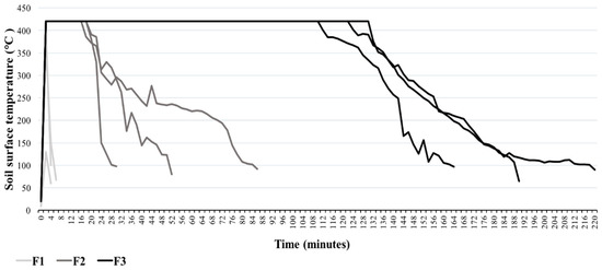 For this experiment, extensive research was carried out to produce the best experimental burn design as detailed in the Materials and Methods section. Some studies [43,44] that used the same recommendations of fuel load for medium and high intensity burns, 20 and 40 t ha−1 respectively, found that medium intensity fires burned for ca. 17 min and high intensity fires burned for ca. 37 min [45]. The Damak experiment followed the same fuel load recommendations; however, the mean burn time >100 °C for F2 and F3 were 55.67 and 190.67 min, respectively. An explanation for this is could be attributed to the size of burn area; the area for one study was 105 m2 [44] and another was 80 m2 [43]. A larger burn area would create a more severe fire and therefore, burn at a quicker rate. These differences are possibly due to different instrumentation, being that these studies used thermocouples that measured temperature directly within the soil. Our experiment used an infrared thermometer that measured the soil surface temperature. The burning material on the soil surface would make both the burn time and temperature a higher reading compared to studies that use thermocouples due to the soils insulating properties.