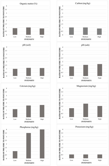 The potassium (K) level after all fire treatments was significantly lower than the pre-fire levels, ca. 50% reduction. This is not supported by much of the literature measuring K levels post-fire events [2,53]. As the volatilisation of K occurs at ca. 750 °C, this reduction would be expected in very high fire intensity events, however, we have observed the reduction in F1 (low intensity) so the reduction in K cannot be attributed to volatilisation. The instrumentation accuracy was high for K (87%), so the reduction cannot be an instrumentation error. There is a possibility that being left in the soil sample bags for 2 months the K cations bound to inorganic substances; however, similar reductions would be observed in F0 if this was the case. A probable reason is that the available potassium was immobilised within mineral structures driven by thermal treatment.