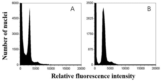 Nuclear suspensions were analyzed by flow cytometry (Partec, Cube8, Germany) equipped with a blue 488 nm laser at a low flow rate (0.5 μL/s). Each sample with at least 10,000 nuclei was collected before it was subjected to FCM analysis. A histogram of DNA content of each sample was evaluated using the Sysmex Express 4 Flow Research Edition software. Only data collected from samples that had G1/G0 (pre-synthesis of DNA in interphase in cell division) peaks with a coefficient of variation (CV) <5% were used to estimate the samples’ genome sizes. Three independent repeats in each cultivar or genotype were measured for the purpose of estimating average genome size and standard deviation.