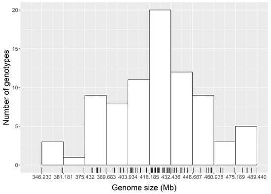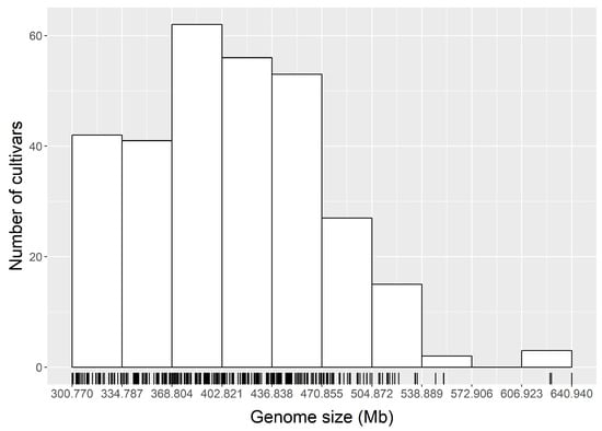The genome sizes of the 301 cultivars were plotted in a histogram where there were 10 bins (groups) (Figure 2). The number of cultivars falling into each bin/group was 42, 40, 63, 56, 53, 27, 15, 2, 0, and 3, respectively. The genome sizes in the group with highest number of cultivars (20.93%) ranged from 334.787 to 368.804 Mb.