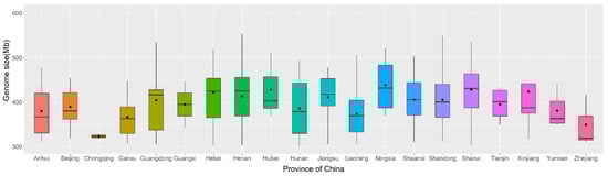 A boxplot was made to manifest the variation of genome size in each province of Chinese jujube, as shown in Figure 3. The results indicate a striking variation that existed in the genome sizes of Chinese jujube cultivars across provinces, especially in those from traditional production areas like Hebei, Henan, Shandong, Shanxi, and Shaanxi. The results also showed that the average genome sizes of Chinese jujube cultivars in different provinces were quite different.