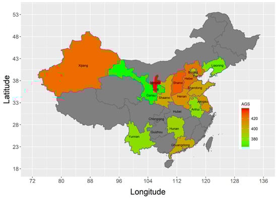 A map illustrating the average genome sizes of Chinese jujube cultivars in different provinces of China. AGS: Average genome size (Mb), indicated by the colors shown.