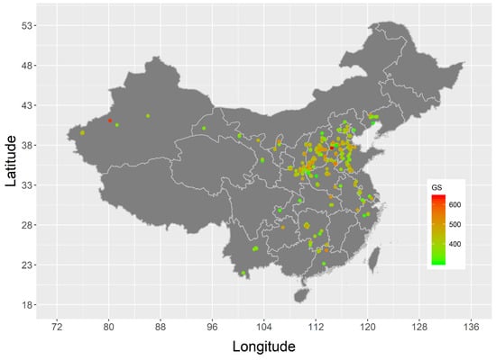 Geographic distribution of genome sizes of Chinese jujube cultivars. GS: genome size (Mb). The names and areas of the province correspond to the same areas shown in Figure 4.
