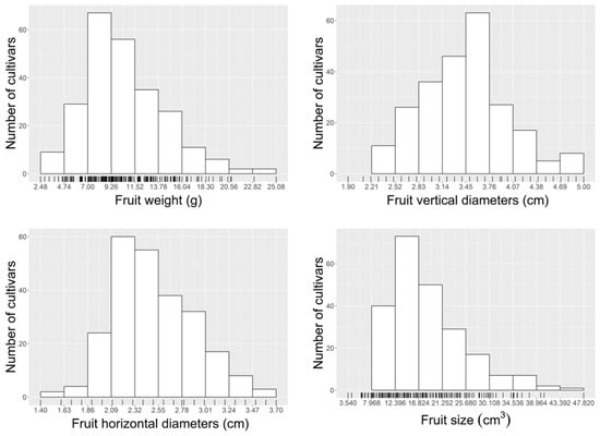 Histogram distribution of four fruit morphological traits of 243 Chinese jujube cultivars.