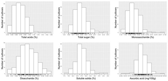 A total of 243 cultivars of Chinese jujube under stable growth condition for at least 10 years were selected from 301 cultivars for the analysis of fruit chemical traits, including total acids (TA), total sugar (TS), monosaccharide (MA), disaccharide (DA), soluble solids (SS), and ascorbic acid (Vc). These fruit traits were determined by following the procedure, as described previously [].