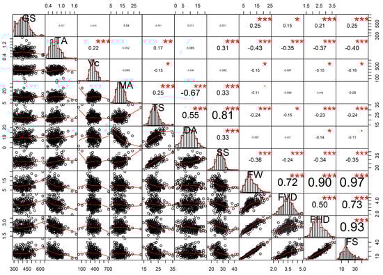 Correlation analyses between genome size and multiple fruit traits. GS: genome size; TA: total acids; Vc: ascorbic acids; MA: monosaccharides; TS: total sugars; DA: disaccharides; SS: soluble solids; FW: fruit weight; FVD: fruit vertical diameter; FHD: fruit horizontal diameters; FS: fruit sizes; The x and y axes for each plot is dependent on where the plot is. For example, the y axes for all plots in the first column are all GS, and the x axes for all plots in the bottom row are all FS. Therefore, the bottom plot in the first column has a y-axis of GS and an x-axis of FS. Asterisks *, **, and *** represent the statistical significance differences of p-values < 0.05, 0.01, and 0.005 (Student’s t-test), respectively.