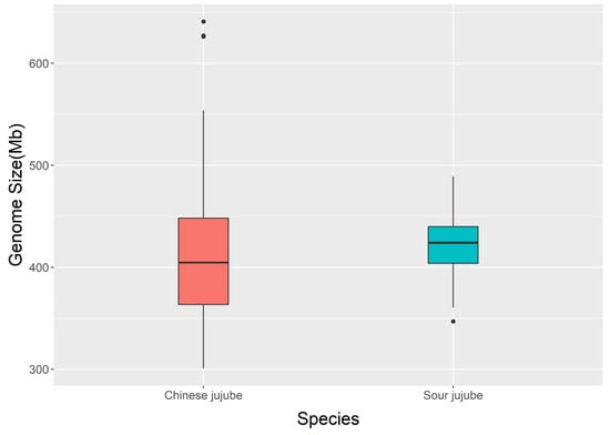 The median and average values of genome sizes were 404.68 Mb and 408.54 Mb for Chinese jujube and 424.18 Mb and 423.55 Mb for sour jujube, respectively (Figure 10). The overall genome size of Chinese jujube genome is smaller than that of sour jujube. For Chinese jujube, there were three extreme outliers (triploids), “Zanxindazao”, “Jinzandazao”, and “Zanhuangdazao”, whose genome sizes were 626.21 Mb, 627.13 Mb, and 640.94 Mb [], respectively. After removing the three triploids, the average genome size of the Chinese jujube is 406.29 Mb.