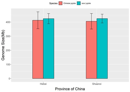 Though the median and average genome sizes of sour jujube were larger than those of Chinese jujube, we noticed that the sour jujube genotypes we used were mostly from Hebei and Shaanxi provinces. To increase the comparability, we also compared the genome sizes of Chinese jujube and sour jujube using the cultivars or genotypes from these two provinces. The results showed that the average genome size of sour jujube was still slightly larger than that of Chinese jujube (Figure 11).