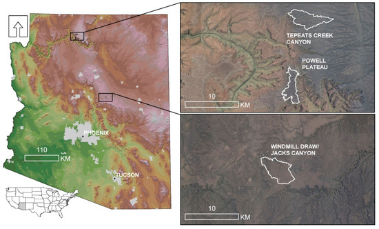 Map of study landscapes in northern Arizona, USA. Powell Plateau and Tepeats Creek on the North Rim of the Grand Canyon, and Windmill Draw/Jacks Canyon on the Mogollon Rim.