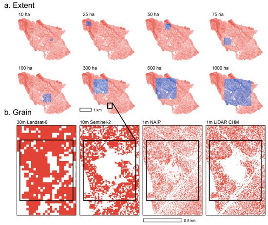 Quantifying spatial heterogeneity of forest structure can be used as a tool to measure the ecological integrity of a system and forest structural and compositional complexity. Scale is an important component of our ecological view of the landscape. Metrics used to describe forest structure, and spatial heterogeneity of a landscape will vary dependent on the scale at which they are examined [10,15]. Scale within a landscape context can be defined in terms of both grain and extent [15,16,17]. The spatial grain of the landscape is the smallest resolution of the data. Extent is the overall size of the landscape or area encompassed by the observation. Extent and grain determine the upper and lower limits of the observation, and changes in both grain and extent affect the patterns detected and the inferences we make. Canopy cover is a metric that is widely used in modeling species habitat relationships, spatial patterns, fragmentation, forest resilience, stand density and many other areas of interest [13,18,19]. It has also been used in land management direction as a surrogate for wildlife habitat quality. However, canopy cover is measured or extracted in multiple ways at multiple spatial scales and extents that can vary by the user-defined parameters. Often this metric is used without explicitly defining how canopy cover was measured or classified.