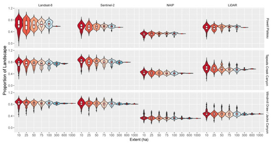 Violin plots (colored by extent and depicting probability density of the data at different values smoothed by a kernel density estimator), box-and-whisker plots (black and white), and mean (red dot) for the proportion of landscape (ha) under forested canopy cover for each landscape and data product (Landsat-8 30 m, Sentinel-2 10 m, NAIP 1 m, LiDAR 1 m), and across multiple spatial extents. Insets with rescaled y-axis provided for clarity.