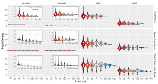 Violin plots (colored by extent and depicting probability density of the data at different values smoothed by a kernel density estimator), box-and-whisker plots (black and white) and mean (red dot) for patch density (patches per ha). Patch density is the number of patches per landscape area under forested canopy cover for each landscape and data product (Landsat-8 30 m, Sentinel-2 10 m, NAIP 1 m, LiDAR 1 m), and across multiple spatial extents. Insets with rescaled y-axis provided for clarity.