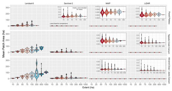 Violin plots (colored by extent and depicting probability density of the data at different values smoothed by a kernel density estimator), box-and-whisker plots (black and white), and mean (red dot) for mean patch area (ha) (average size of patches) for each landscape and data product (Landsat-8 30 m, Sentinel-2 10 m, NAIP 1 m, LiDAR 1 m), and across multiple spatial extents. Insets with rescaled y-axis provided for clarity.