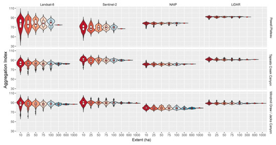 Violin plots (colored by extent and depicting probability density of the data at different values smoothed by a kernel density estimator), box-and-whisker plots (black and white) and mean (red dot) for aggregation index (0–100). Aggregation index indicates how adjacent patches of canopy cover are to each other for each landscape and data product (Landsat-8 30 m, Sentinel-2 10 m, NAIP 1 m, LiDAR 1 m), and across multiple spatial extents. Insets with rescaled y-axis provided for clarity.