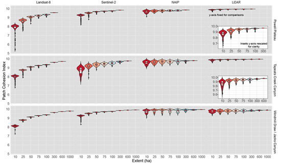 Violin plots (colored by extent and depicting probability density of the data at different values smoothed by a kernel density estimator), box-and-whisker plots (black and white) and mean (red dot) for patch cohesion index (%). Patch cohesion index describes the physical connectedness of patches of canopy cover for each landscape and data product (Landsat-8 30 m, Sentinel-2 10 m, NAIP 1 m, LiDAR 1 m), and across multiple spatial extents. Insets with rescaled y-axis provided for clarity.