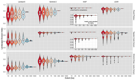 Violin plots (colored by extent and depicting probability density of the data at different values smoothed by a kernel density estimator), box-and-whisker plots (black and white) and mean (red dot) for landscape division index (%). Landscape division index is presented for each landscape and data product (Landsat-8 30 m, Sentinel-2 10 m, NAIP 1 m, LiDAR 1 m), and across multiple spatial extents and is defined as the probability that two animals placed in different areas somewhere in the extent might find one another. Insets with rescaled y-axis provided for clarity.