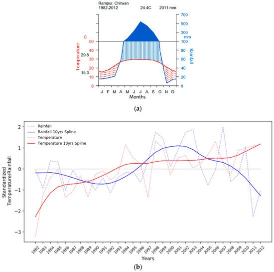 (a) Monthly data and annual trend; (b) trend of annual precipitation and temperature. Data collected from the Rampur meteorological station, Chitwan, Nepal (Source: [30]).