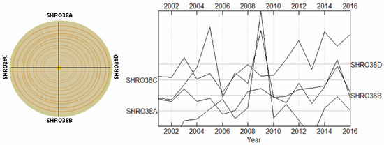 After the measurements was complete, all samples were cross-dated using the alignment plotting technique, looking at the samples, math graph, and cross-dating statistics [31]. The sample showed an irregularity in the ring distribution—basically inclining towards one end—and, as a result, the number of tree rings is not equally distributed in all radii end of the disc. Similarly, the distribution of ring width around the entire disc sample was not symmetrical, i.e., the same rings had some wide sides and other narrow sides. Figure 3 depicts the synchronization patterns of tree growth along four radial directions. The overall growth patterns in each radial direction were found to be synchronized to each other, especially for the years 2003, 2006, 2009, 2013, and 2015. From Figure 3, it is clear that the growth in the perpendicular radial direction tends to synchronize better than the growth in the opposite direction. The alignment plotting technique is a visual method of cross-dating based on the relative scale prepared by matching the width of relatively narrow and wide rings. At first, an average time series of four radii of each cut stump sample was taken, and an average chronology of each tree was prepared. After that, between-tree cross-dating was done using TSAP [31]. The errors in cross-dating were rechecked by using the quality control computer program, COFECHA, and were corrected [32,33].