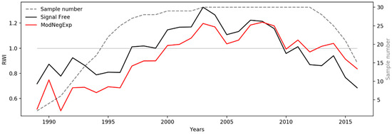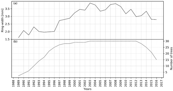 There was a total of 120 raw tree-ring width series prepared from 30 cut-stump samples, each measured in four radii directions (Figure 3). Then, the four radii of each tree were averaged, and the value was used as one series. Therefore, we have a total of 30 tree-ring width series. The mean raw chronology of 30 tree-ring series is depicted in Figure 4, along with a number of samples representing the chronology for each year. The raw chronology shows that the annual radial growth was slow in the beginning, then it rapidly increased, and then slightly decreased in the years 2009 to 2016. The raw chronology in Figure 4 may have some external and internal influences on growth. Figure 5 presents standard and signal-free chronology. Both types of chronologies show an increase in growth in the earlier period and a slight decrease in the latter period (Figure 5).