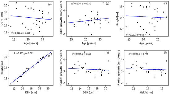 Relationship between the growth and different size variables of S. robusta; (a) DBH-age relationship; (b) age-growth relationship; (c) age-height relationship; (d) DBH-height relationship; (e) DBH-growth; and (f) height-radial growth relationship. DBH: Diameter at breast height.