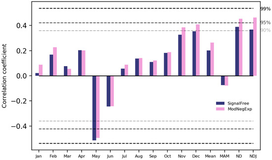 Correlation of S. robusta ring-width chronology with temperature. Jan, Feb, ..., Dec are months. Mean, MAM, ND, and NDJ indicate the annual average temperature, the average temperature of March to May, the average temperature of November–December, and the average temperature of November–January, respectively.