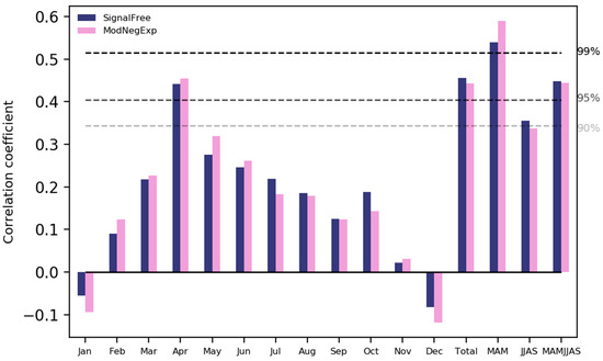 Correlation of S. robusta chronology with precipitation. Jan, Feb, ..., Dec are months; MAM, JJAS, and MAMJJAS indicate average total precipitation of March to May, June to September, and March to September, respectively.