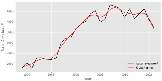 The total basal area of S. robusta in different years of measurement based on permanent sample plots.