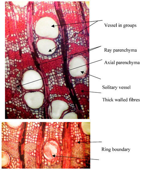 Only limited species form true annual rings in tropics due to a lack of climatic extremes that alter cambial growth. In addition, site-specific and endogenous factors play a vital role in wood development, which makes it difficult to understand and interpret the tree-ring features in tropical trees [71]. Large vessels (about 50 µm in diameter) in S. robusta seem to be adapted to enhance water conduction, as large vessels conduct water more efficiently. In general, vessel diameter, rather than vessel number, determines the potential hydraulic conductivity [72]. A thick band of vascular tracheid and fibres observed in S. robusta wood are a characteristic feature in a climax species [73] and are directly linked to the mechanical support function.