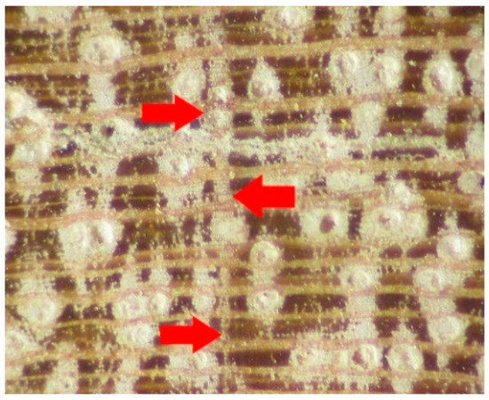 The growth rings of S. robusta were indistinct in cross-sections but could be identified after sanding and polishing. They could also be identified from the wood anatomical study. In the current study, it seems that marginal axial parenchyma cells in bands are forming growth rings. However, the continuous formation of growth rings was not observed in the cross-section. Sometimes, the irregular parenchyma bands formed during xylem increment in S. robusta can be mistaken for annual rings [68]. In some cases, the tangential arrangement of traumatic gum canals was causing the formation of ring-like growth structures. Therefore, the resin canals of S. robusta, which is hardwood and from lower elevation range, may not be annual rings because tropical trees often produce more than one growth rings per year, and the feature differs from opposite sides of the same tree [68,69]. Previous studies also found similar features in S. robusta wood. The darkening of growth rings was also observed in the S. robusta wood collected from the Terai and mid-hills of Nepal, but the growth rings were not annual rings [70].