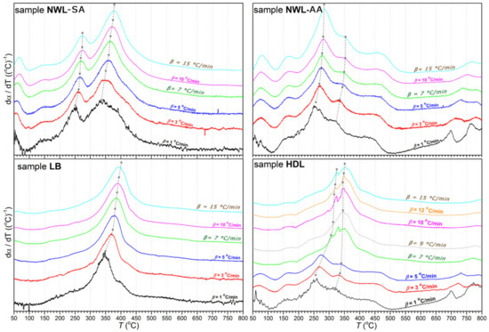 dα/dT curves of lignin samples at all heating rates (from β = 1 °C/min to 15 °C/min).
