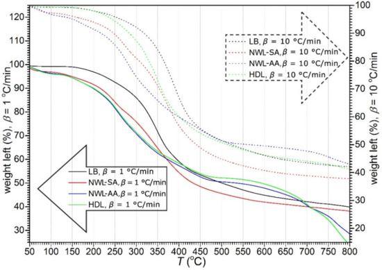 Kinetic parameters, such as the pre-exponential factors and activation energies, are presented in Table 5. The activation energy values of the lignin samples ranged from 93 to 281 kJ/mol. For the LB lignin, the only value determined was 174.9 kJ/mol. On the contrary, the thermal decomposition of the HDL, NWL-SA, and NWL-AA lignins occurred in two stages with different activation energies. Values of the coefficient of determination (R2) found for the four lignin samples indicated a suitable fit between kinetic parameters (Table 5).
