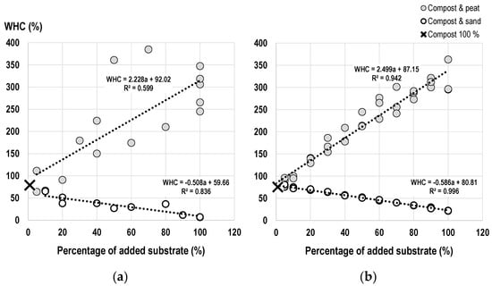 Interrelationship between the percentage of added sand and peat and the WHC of the substrate mixtures: (a) WHC determined according to the “droplet counting method” []. (b) WHC determined according to the “cylinder sand bath method” [].