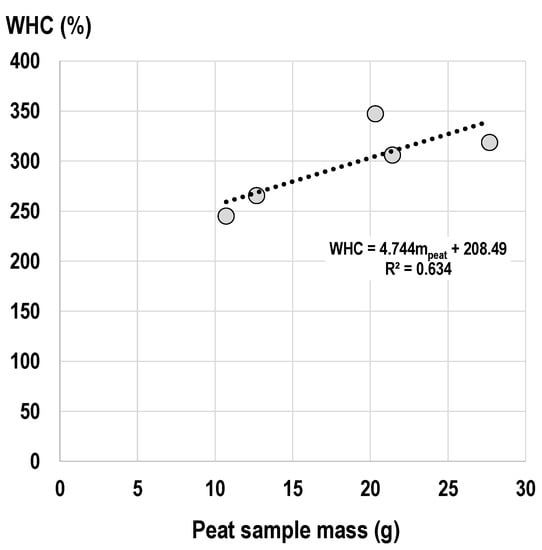 Figure 2. Interrelationship between the WHC of peat according to the ‘droplet counting method’ (CEN/TS 15083-2, 2005) and the mass of the peat sample.