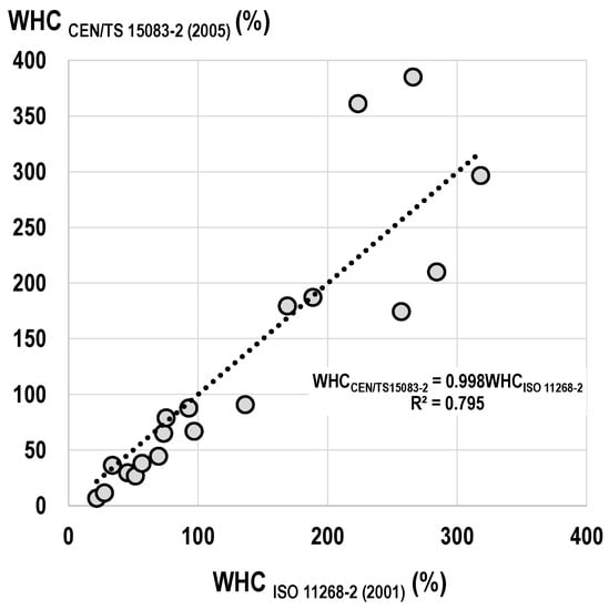 The WHC determined according to both methods were highly correlated, especially for WHC below 200%, as shown in Figure 3. Therefore, and regarding its numerous advantages, in the following, all WHC measurements were conducted using the “cylinder sand bath method”.