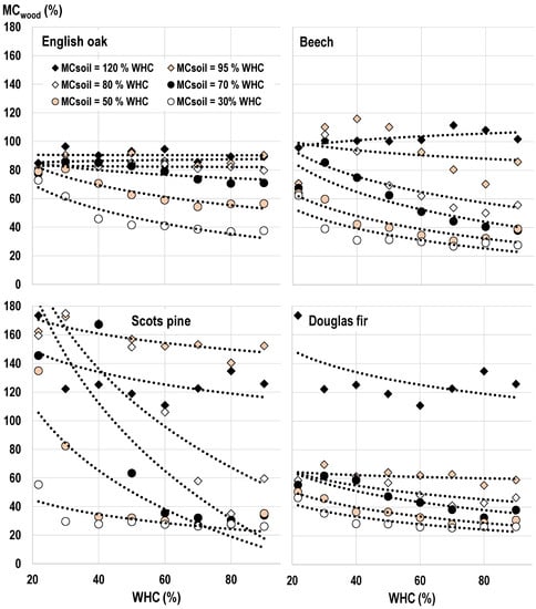 This effect became especially prominent when considering MCsoil as a percentage of the WHC of the soil as illustrated in Figure 4. The lower MCsoil (%WHC), the lower the MCwood was at a given WHC of the substrate in the TMCs. However, it also became apparent that the effect of MCsoil became more pronounced at higher WHCs, i.e., the range of MCwood between 30% and 120% MCsoil expressed as percentage of its WHC was higher by up 2 factors in substrates of high WHC (120%) compared to those with very low WHC (30%).