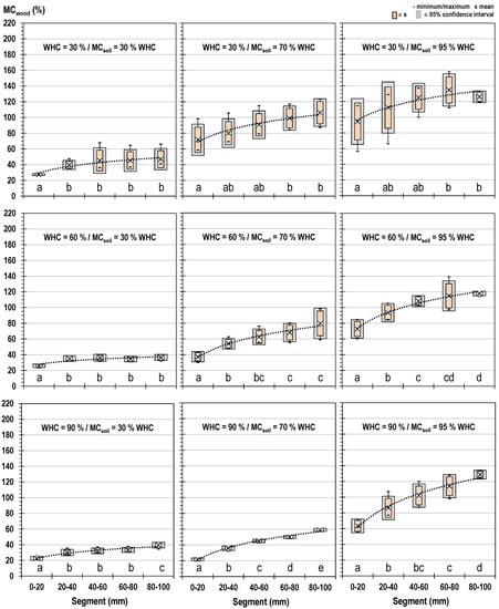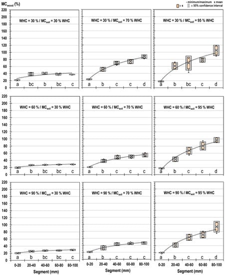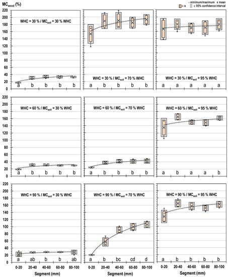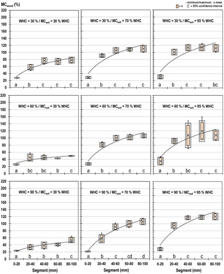 The MCwood in specimens buried to 4/5 of their length in TMCs showed partly drastic gradients from high moisture content in the bottom to less in the upper part, which was not buried (Figure 6, Figure 7, Figure 8 and Figure 9). Solely, Scots pine sapwood specimens exposed at high MCsoil (95%WHC) showed barely significant gradients, but very high MCwood in all parts of the specimen. Similarly, deviating MCwood gradients were reported by Mieß [] for Scots pine sapwood specimens. As expected, generally, the highest difference in MCwood was found between the upper segments and upper next segments.