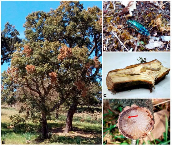 Cork oak tree showing multiple branch dieback symptoms (a), adult and larvae of Coraebus florentinus (b,c), and necrotic wood tissues surrounding the beetle gallery (red arrow) on a cork oak branch (d).