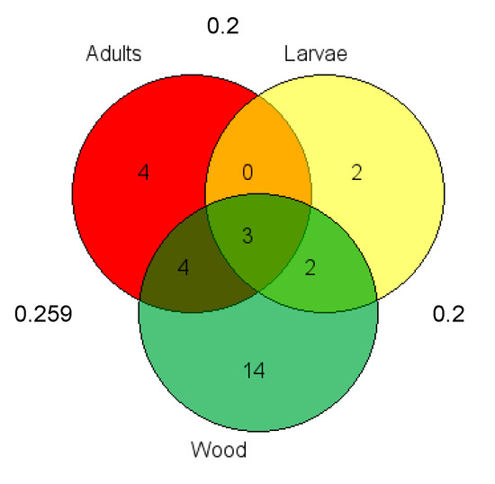 The Jaccard similarity coefficient showed a low similarity value between insect and plant fungal communities, indicating that only a few fungal species could be efficiently vectored by C. florentinus (Table 5). The highest overlap (Jc = 0.259) was observed for the fungal communities from adults and wood tissues, indicating that many of the isolated fungi are not essential for larvae development (Figure 2).