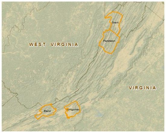 Location of the study sites on the George Washington-Jefferson National Forest (Bland County, Virginia; 37.13° N, −81.16° W), the Fishburn Forest (Montgomery County, Virginia; 37.19° N, −80.47° W), and the Monongahela National Forest (Grant and Pendleton counties, West Virginia; 38.92° N, −79.25° W and 38.61° N, −79.58° W).