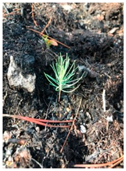 Many studies have examined the importance of wildland fire for Table Mountain pine (Pinus pungens Lamb.) regeneration, a fire-adapted, Appalachian endemic tree species [50]. This species possesses serotinous cones and exhibits shade intolerance. It has been suggested that periodic, high intensity, stand replacement fires might best promote conditions needed for Table Mountain pine regeneration. This includes heat to open the serotinous cones and bare mineral soil in which the released seed may germinate [51,52]. Other studies, however, suggest that frequent, low intensity fires may actually be most beneficial for long-term Table Mountain pine development and stand maintenance [3,50,51,52,53]. These conditions might be more easily obtained through the use of frequent and repeated low intensity prescribed fires. This is a critical management consideration for these ecological communities in this region given their threatened and endangered status. In our study we found numerous Table Mountain pine seedlings present post-wildfire in Bland County (Figure 4). These seedlings were growing in duff greater than 3.69 cm deep. This is similar to the findings of Mohr et al. [54]; numerous seedlings were found in their study growing in 7.5 cm duff. In conjunction with these other studies, this information may provide much-needed information to better understand how these communities can be restored and maintained over time.