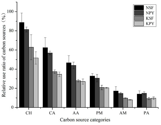 The relative use ratio of six carbon substrate categories for the two vegetation types in the non-karst and karst areas of southern China. NSF—non-karst secondary forest; NPY—non-karst Pinus yunnanensis plantation; KSF—karst secondary forest; KPY—karst Pinus yunnanensis plantation; CH—Carbohydrates; CA—Carboxylic acids; AA—Amino acids; PM—Polymers; AM—Amines amides; and PA—Phenolic acids. Bars indicate standard error.