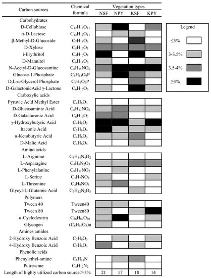 The map of soil microbial CLPP showed that the different vegetation types also influenced the soil carbon source utilization patterns (3% of the total use values of each ECO-plate were selected as the base of the carbon source) (Figure 2). Under different vegetation types, the main carbon source types that contributed to the CLPP differences were five carbohydrates, two amino acids, two polymers, two amides, and one phenolic acid in the non-karst area. However, in the karst area, these were D–cellobiose, α–D–lactose, D,L–α–glycerol phosphate, D–galactonic acid γ–lactone, α–ketobutyric acid, D–malic acid, L–serine, Tween 40, glycogen, and 4–hydroxy benzoic acid, respectively.