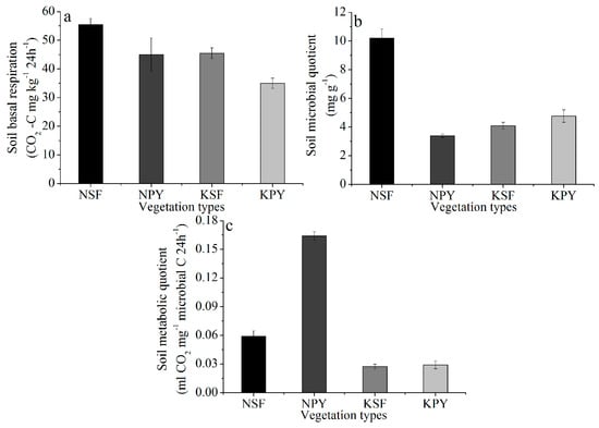 The soil microbial activities under different vegetation types. (a) Soil basal respiration; (b) Soil microbial quotient; and (c) Soil metabolic quotient.