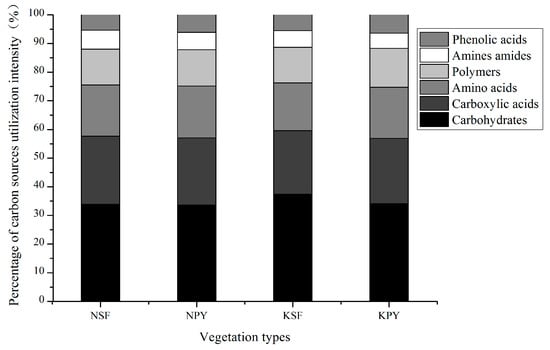 The utilization percentages of six categories of carbon substrates under different vegetation types.