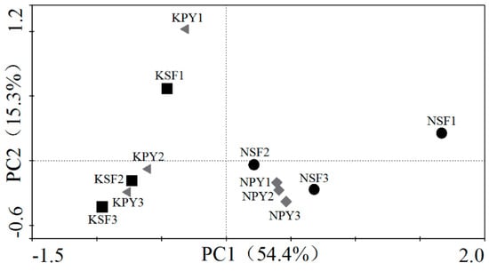 Various modes of carbon source utilization suggest a different availability and quality of carbon sources in the soils []. The microbial communities in the non-karst area were more efficient in utilizing the six carbon substrates categories than those of the karst area with the same vegetation types (Figure 1). This was confirmed by previous studies, according to which the calcareous soil holds a higher proportion of recalcitrant organic carbon, which cannot be effectively used by the soil microbial community [].