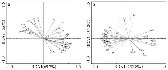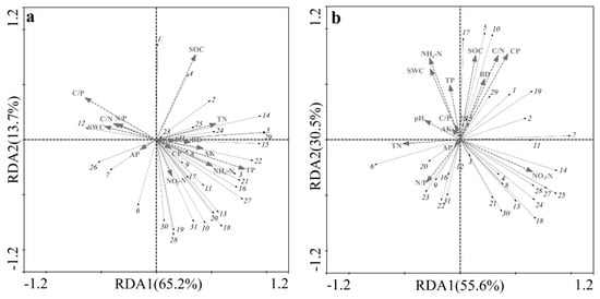 Redundancy analysis of the carbon source use patterns of microbial communities under (a) the secondary forest and (b) the Pinus yunnanensis plantation. The carbon substrates are: 1: D–Cellobiose, 2: α–D–Lactose, 3: β–Methyl–D–Glucoside, 4: D–Xylose, 5: i–Erythritol, 6: D–Mannitol, 7: N–Acetyl–D–Glucosamine, 8: Glucose–1–Phosphate, 9: D,L–α–Glycerol Phosphate, 10: D–Galactonic Acid γ–Lactone, 11: Pyruvic Acid Methyl Ester, 12: D–Glucosaminic Acid, 13: D–Galacturonic Acid, 14: γ–Hydroxybutyric Acid, 15: Itaconic Acid, 16: α–Ketobutyric Acid, 17: D–Malic Acid, 18: L–Arginine, 19: L–Asparagine, 20: L–Phenylalanine, 21: L–Serine, 22: L–Threonine, 23: Glycyl–L–Glutamic Acid, 24: Tween 40, 25: Tween 80, 26: α–Cyclodextrin, 27: Glycogen, 28: 2–Hydroxy Benzoic Acid, 29: 4–Hydroxy Benzoic Acid, 30: Phenylethyl–amine, and 31: Putrescine. The same below.