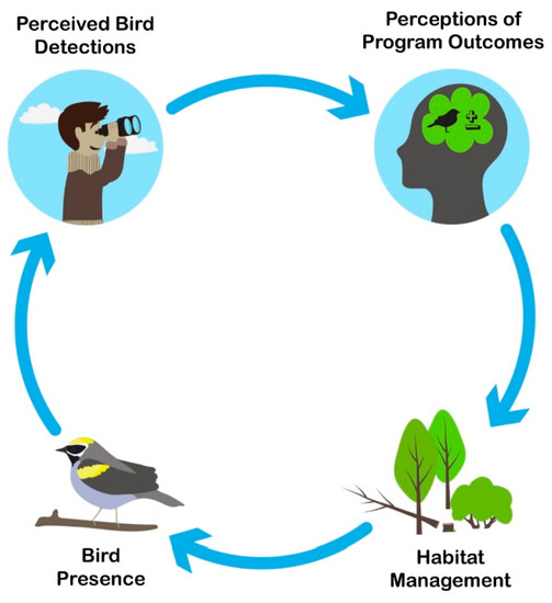 How landowners detect and interpret changes on their land is important for understanding their future and long-term management decisions [21,22,23]. Landowner actions can be informed by the environmental outcomes of past management, if these outcomes are apparent to landowners [22,24,25]. Previous research has shown that landowners are generally motivated to create early successional forest by benefits to wildlife, the environment, and hunting [26,27]. Landowners who previously managed for early successional forest are more likely to do so again [27]. This could indicate a positive response to management outcomes such as increased wildlife sightings or improved scenic attributes of managed forests (e.g., [23,28,29]). Yet management outcomes are not always positive, and some authors have speculated that landowners managing for specific wildlife such as the Golden-winged Warbler might discontinue management if those species do not appear [30]. To understand how these environmental feedbacks could influence landowner decisions, we applied a coupled human and natural systems (CHANS) framework [31,32]. We focused primarily on birds given the avian focus of the conservation incentive program.