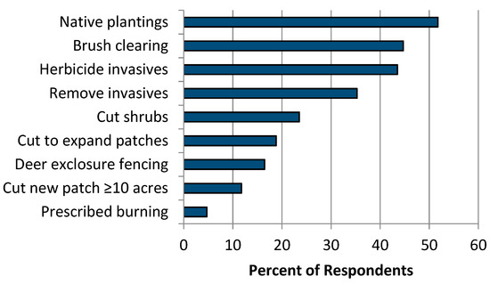 Of 102 survey respondents, 85 had completed their NRCS contracts at the time of the telephone survey. Among these 85 landowners, the average time since their contract ended was 2.09 years (min = 0 years, max = 4 years). The minimum remaining property area was 8.2 hectares. The majority of landowners (71.8%) who had completed their contracts had implemented some form of management actions for early successional forest management since their contract ended (Figure 3). The practice used by the most landowners (51.8%) post-contract was establishment or maintenance of native plantings. Fewer landowners had used timber management practices necessary to create early successional forest, such as cutting new patches (11.8%). The least commonly used practice was prescribed burning, performed by only 4.7% of landowners post-contract.