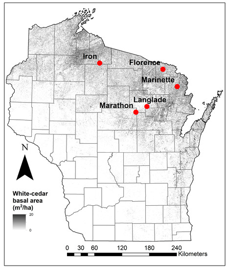 A long-lived, shade-tolerant tree, white-cedar has a native range that spans across the northeast portion of the United States into Canada and as far west as the Great Lakes [2]. White-cedar is an ecologically versatile species that can grow in both early and secondary successional forests, and in well-drained upland or poorly-drained wetland settings. In the Great Lakes region, where this study is focused, most white-cedar harvested for timber products grows in alkaline wetlands as nearly-pure stands [2,3].